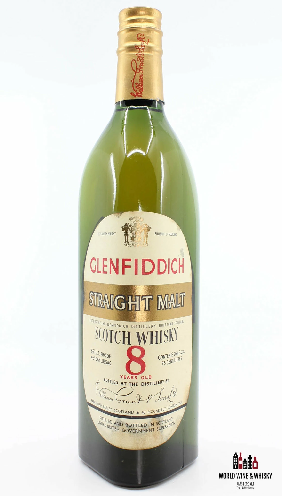 A rare, unique and hard to find 8 Years Old Straight Malt whisky from Glenfiddich. For the last 60 years, the bottles have been stored in a dark and conditioned place. Therefore there has been no ‘sharing angle’.