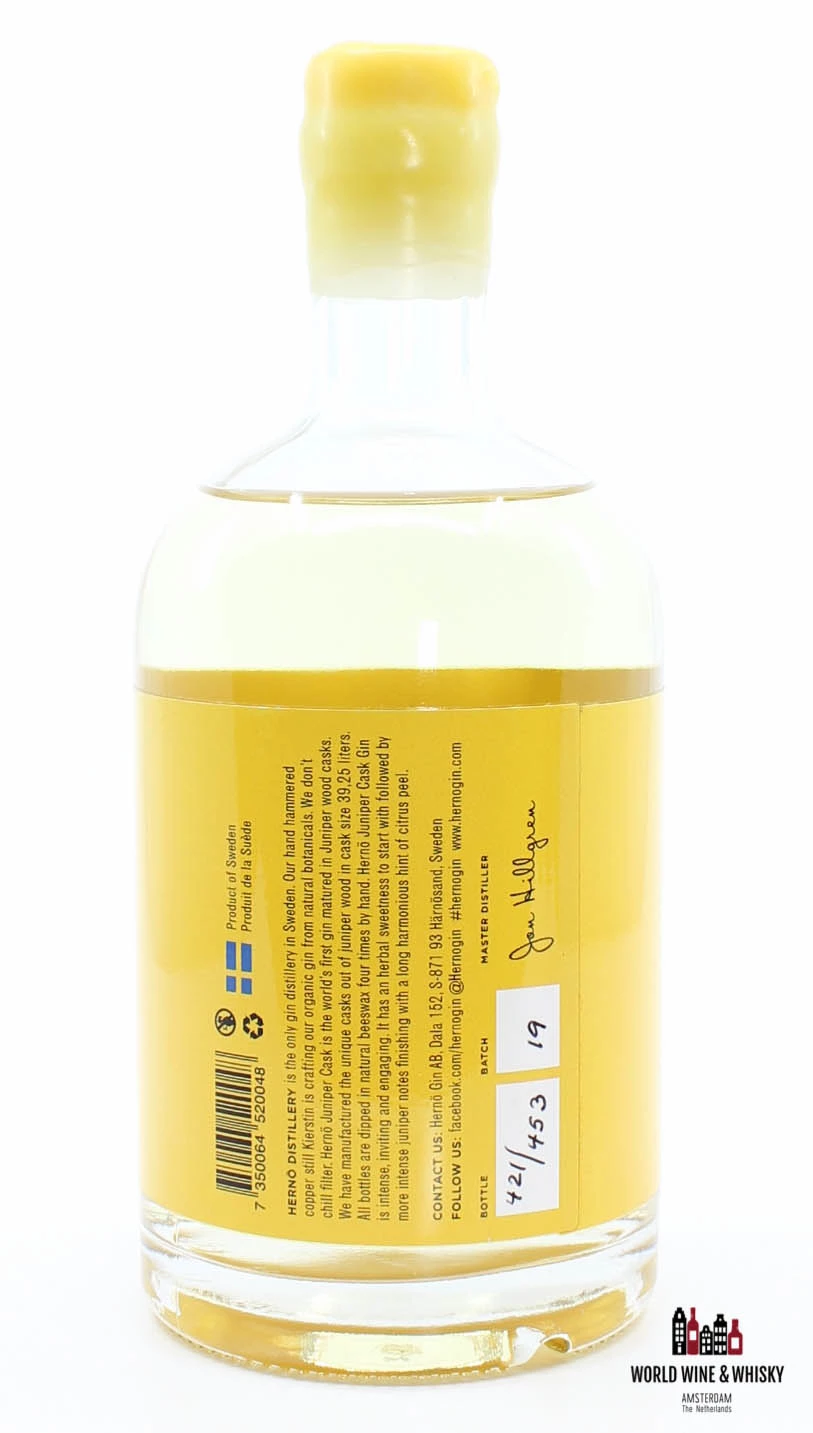 All bottles are dipped in natural beeswax four times by hand. Hernö Juniper Cask Gin is intense, inviting and engaging. It has an herbar sweetness to start with followed by more intense juniper notes finishing with a long harmonious hint of citrus peel.”