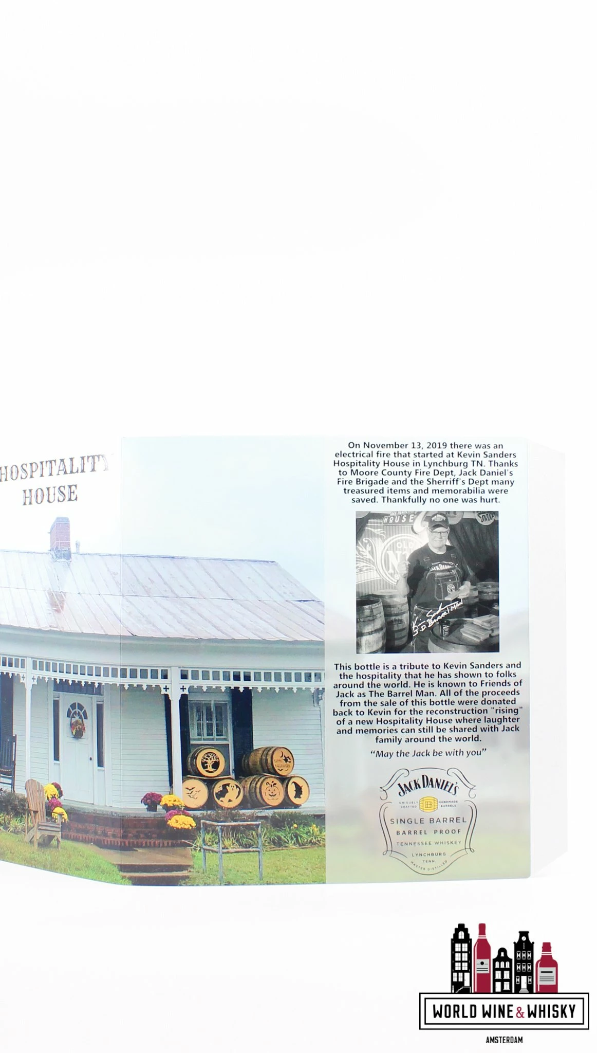 On November 13, 2019 there was an electrical fire that started at Kevin Sanders Hospitality House in Lynchburg TN. Thanks to Moore County Fire Dept, Jack Daniel’s Fire Brigade and Sheriff’s Dept many treasured items and memorabilia were saved. Thankfully no one was hurt. This bottle is a tribute to Kevin Sanders and the hospitality that he has shown to folks around the world. He is known to Friends of Jack as The Barrel Man. All of the proceeds from the sale of this bottle were donated back to Kevin for the reconstruction “rising” of a new Hospitality House where laughter and memories can still be shared with Jack family around the world.